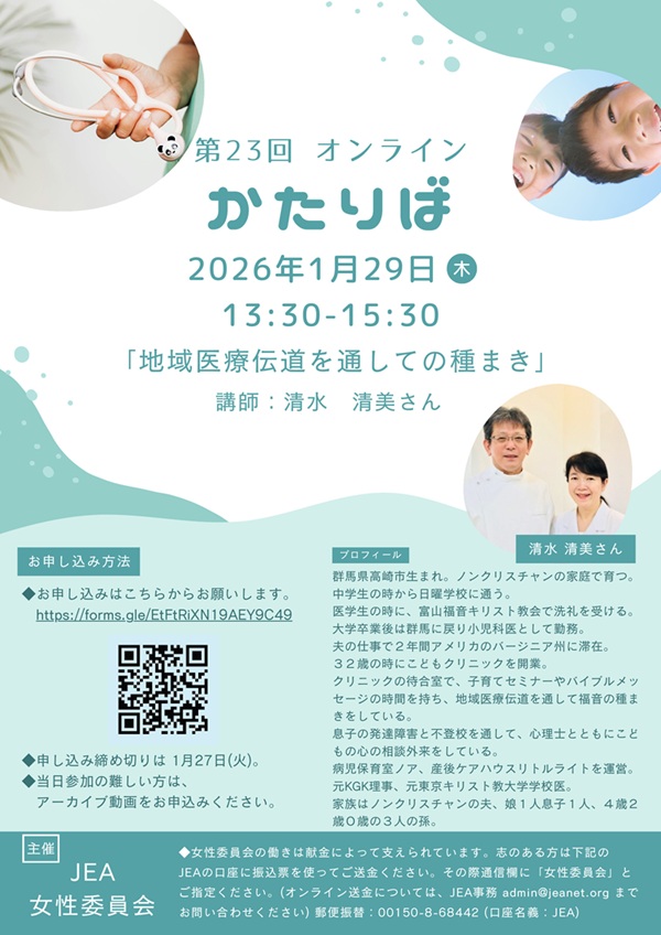 JEA女性委員会よりお知らせ 2026.01.10 JEA女性委員会から1月29日(木)に開催される第23回かたりばオンラインの案内です。 今回は「地域医療伝道を通しての種まき」というテーマで清水清美さんが語ってくださいます。 申し込みはこちらから